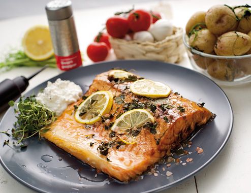 Marinera med injektion och pensla laxen. Låt ligga i ca 1 tim. Dekorera laxen med skivad citron och örter. Grilla i folie eller utan. Grilla i ugn i ca 30 min, innertemp ca 48° (tonfisk eller svärdfisk innertemp ca 30°, vitfisk innertemp ca 50°). På utegrill ca 25–30 min.