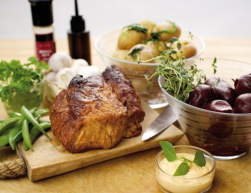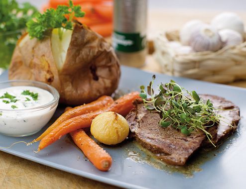 In-Flavor Garlic & Pepper. Långkokt hel högrev som marinerats och grillats med nedkokt sky. Grillad hel färsk vitlök, primörer och bakad potatis med vitlöksås. Förbered hemma tar ca 5 tim. Grilla tar ca 12 min.