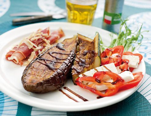 Marinera en aubergine och en zucchini med injektion, halvera dem och pensla ytorna. Låt ligga i ca 1 tim. Grilla i ugn i ca 40 min. Grilla ute i ca 35–40 min. Skiva fetaosten och paprikan. Fördela grillat och skinkan på tallrikar. Dekorera med Glassa gourmet classic.