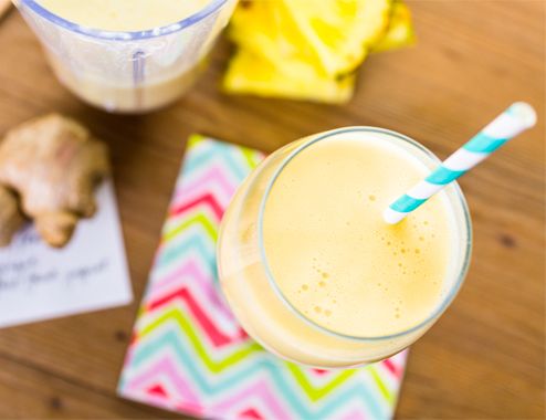 Blanda gurkmeja, ingefära och bitar av citrusfrukter. Lägg alla ingredienser i en blender och mixa slätt. Späd ev. med vatten. Sila genom silduk eller en tunn kökshandduk och tryck ut all vätska. Det går också bra att sila genom en finmaskig sil, men då kommer juicen att skikta sig mer.