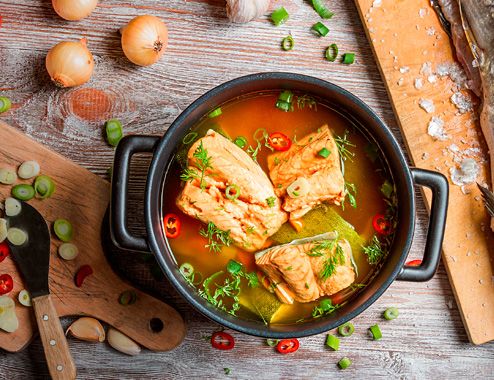 3. Skär fisken i tunna skivor. Lägg ner dem i soppan. Koka på svag värme i ca 5 min. Smaksätt med muskotnöt, ingefära, salt och peppar. Låt soppan få ett uppkok.